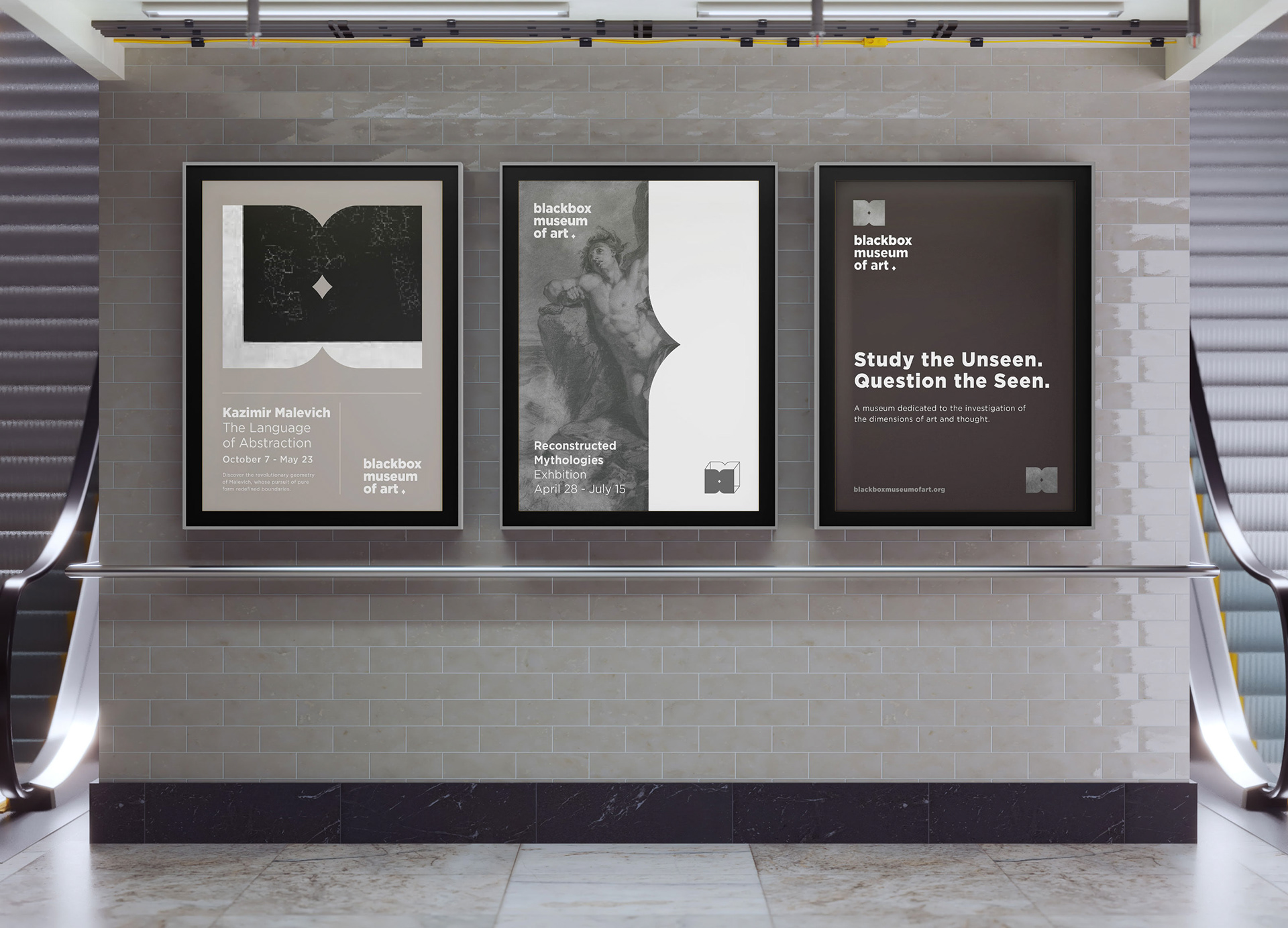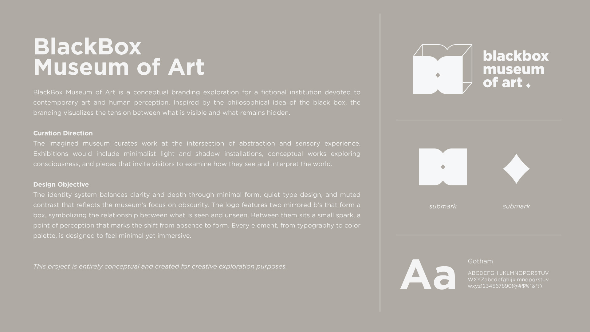BlackBox Museum of Art is a conceptual branding project for a fictional institution devoted to the unseen and the abstract. It imagines a space where contemporary art, minimalism, and human perception converge. The identity expresses these ideas through a clear visual language shaped by type, color, and form.